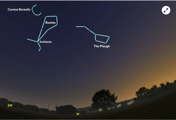 Plough의 손잡이의 곡선을 따라 남서쪽으로 가면 다음으로 밝은 별은 목동자리에 있는 Arcturus입니다. 거기서 북쪽왕관자리는 동쪽(일반적으로 왼쪽)으로 가장 가까이 위치하고 있습니다.